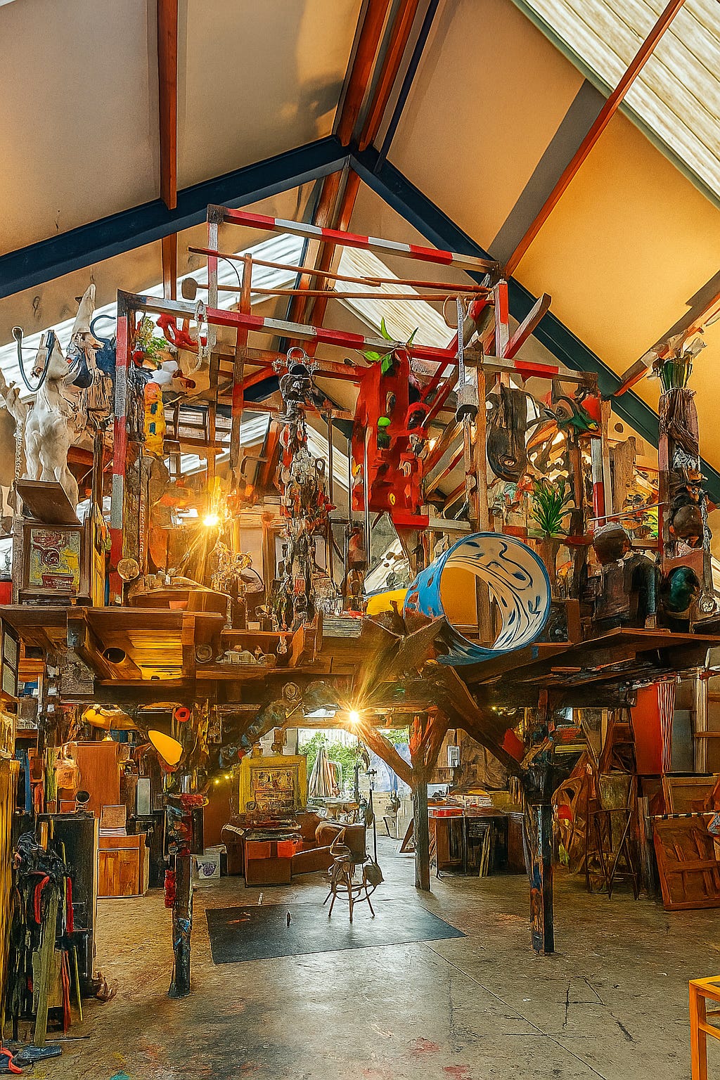 We liepen samen naar de deur in het midden van de tussenwand. De deur leek ook erg klein in de grote loods. Toen deze openging wist ik niet wat ik zag. Jawel, dat wist ik wel. Kunst! Verbazingwekkend veel kunst. Een mengeling van installaties, schilderdoeken, werkruimte en voorraad van materialen om deze installaties mee te bouwen. Een van de installaties was opgebouwd in het midden van de loods. Het reikte bijna tot de nok. Het stond op vier poten. Zo kon je er onderdoor lopen. Aan één zijde was er een trap. Hiermee kon je naar het plateau erboven klimmen.